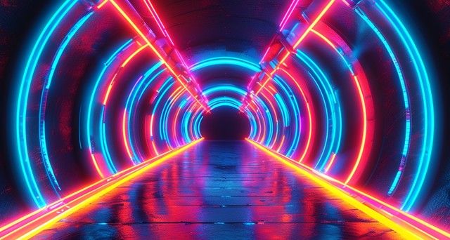抽象霓虹灯科幻未来高科技虚拟现实隧道。 未来派运动图形。 紫外线霓虹灯发光