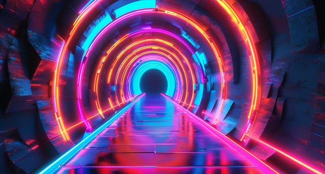 抽象霓虹灯科幻未来高科技虚拟现实隧道。 未来派运动图形。 紫外线霓虹灯发光