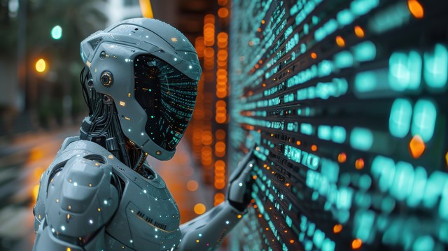 优雅的3D机器人在未来主义的数字空间背景下,象征着现代商业和互联网通信中的技术和数据代码集成