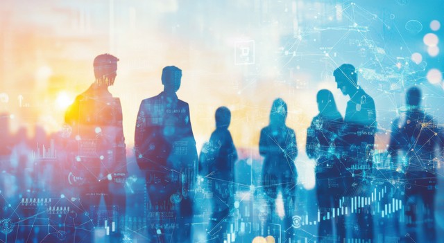 业务团队剪影:在全球办公环境中与数字技术进行交流。团队合作和商业战略的概念形象