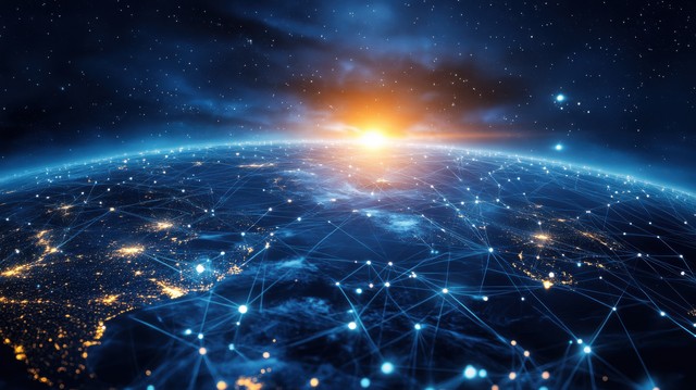 在地球上具有纹理和光线效果的数字分形能量图案插图,是网络空间技术和数据通信的概念设计。