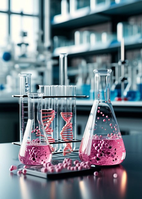 实验室玻璃器皿和脱氧核糖核酸数据。科学概念。