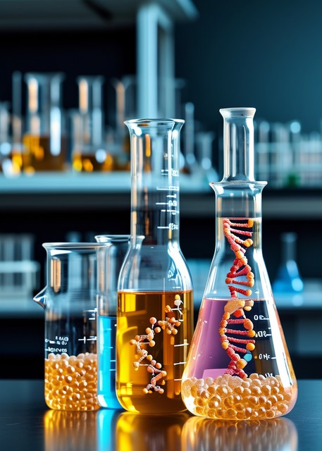 实验室玻璃器皿和脱氧核糖核酸数据。科学概念。