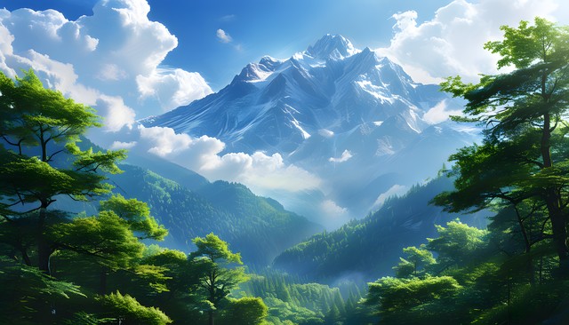 神山环绕着葱郁森林,蓝天白云下的自然美景。