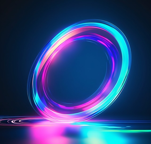 抽象彩色蓝绿色紫色圆形线条在深蓝色背景上发光。现代闪亮的几何条纹圆形线条。未来的数字、技术、现代概念