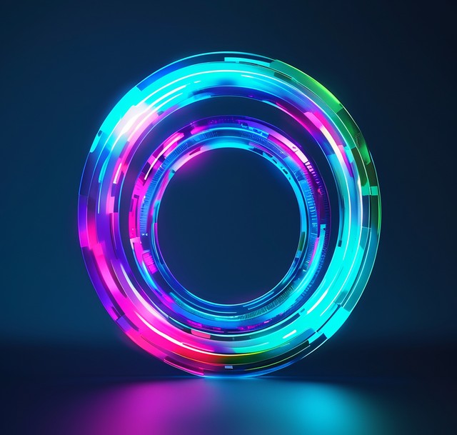 抽象彩色蓝绿色紫色圆形线条在深蓝色背景上发光。现代闪亮的几何条纹圆形线条。未来的数字、技术、现代概念