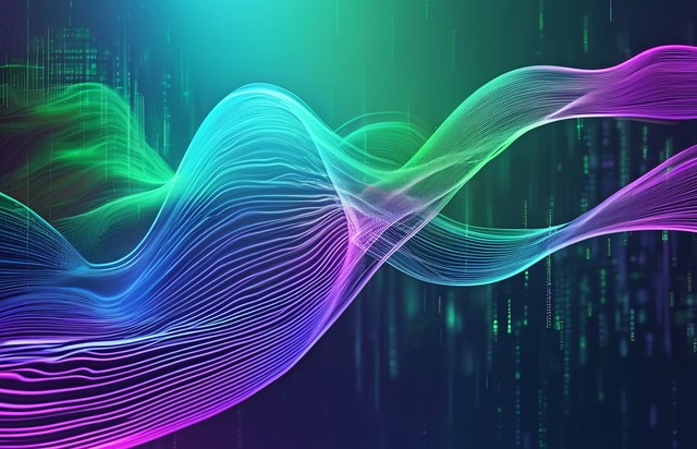 信息技术,数字时代,数据可视化,未来技术背景。未来技术的概念。紫色、蓝色和绿色渐变横幅的平滑波浪线,