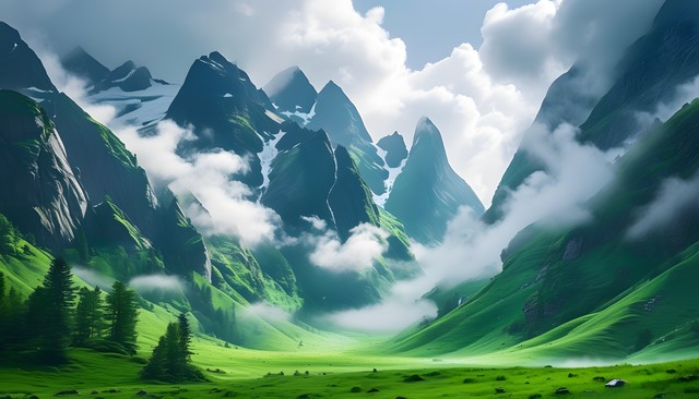 奇妙的山峰与云雾环绕的绿色草地,展现壮丽的自然风光。