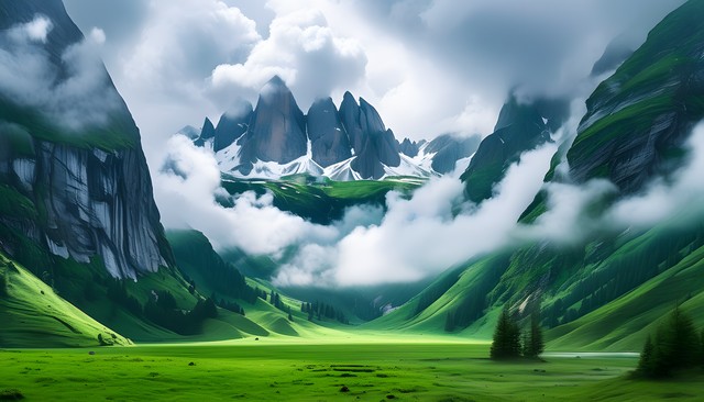 奇妙的山峰与云雾环绕的绿色草地,展现壮丽的自然风光。