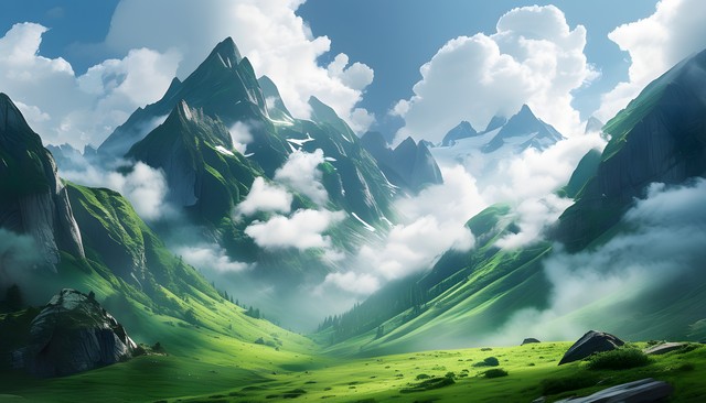 奇妙的山峰与云雾环绕的绿色草地,展现壮丽的自然风光。