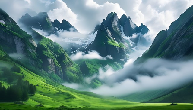 奇妙的山峰与云雾环绕的绿色草地,展现壮丽的自然风光。