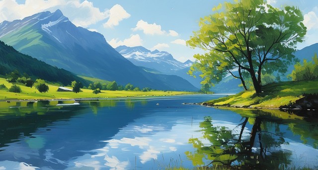 翠绿山水画,湖泊与远山相映成趣,展现自然的和谐美。