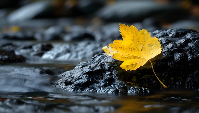 一片孤独的黄色树叶静静地躺在黑色岩石上,展现自然之美。