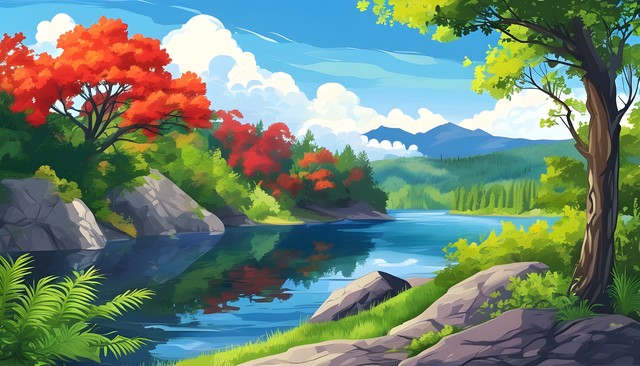 山脉与湖泊交融的美丽自然风景,绿树成荫,草地如茵,花团锦簇。