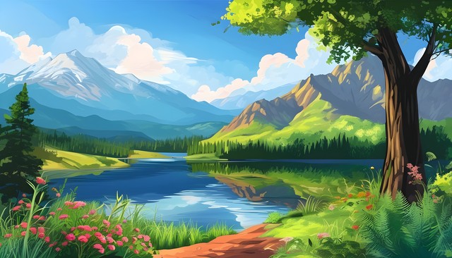 山脉与湖泊交融的美丽自然风景,绿树成荫,草地如茵,花团锦簇。