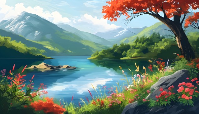 山脉与湖泊交融的美丽自然风景,绿树成荫,草地如茵,花团锦簇。