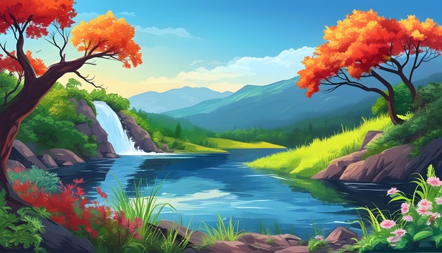 山脉与湖泊交融的美丽自然风景,绿树成荫,草地如茵,花团锦簇。