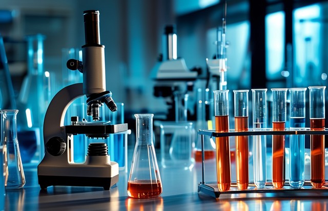 显微镜与试管的实验室场景,展示科研氛围。