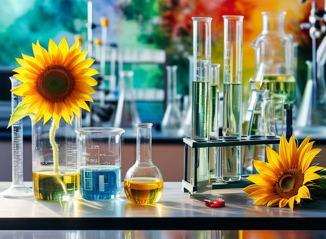 专业实验室玻璃器皿,带有样品、向日葵和彩色背景油