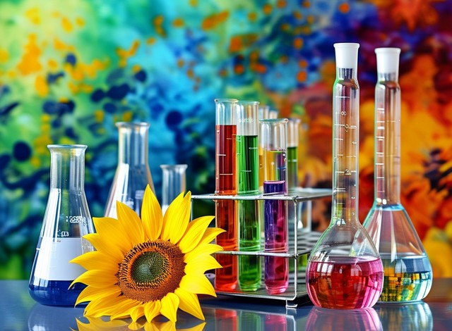 专业实验室玻璃器皿,带有样品、向日葵和彩色背景油