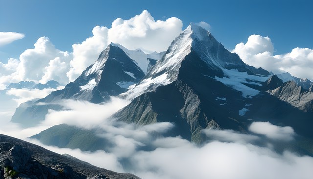 壮丽的雪山与云彩交织的自然风光,展现出大自然的雄伟与宁静。