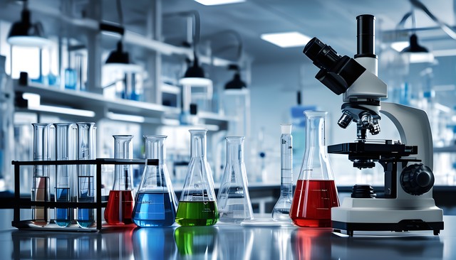 实验室桌面上的各种试管和烧杯,彩色液体展示了实验的丰富性与科学魅力。