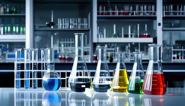 实验室桌面上的各种试管和烧杯,彩色液体展示了实验的丰富性与科学魅力。
