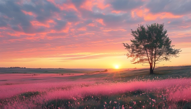 夕阳下的野外景观,一棵孤独的树与粉色草甸交相辉映,呈现自然之美。