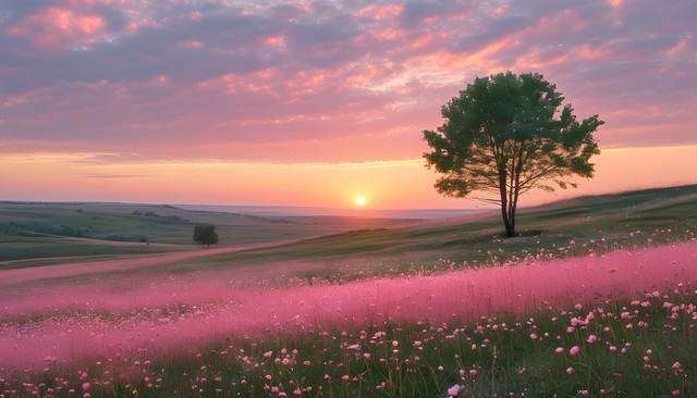 夕阳下的野外景观,一棵孤独的树与粉色草甸交相辉映,呈现自然之美。