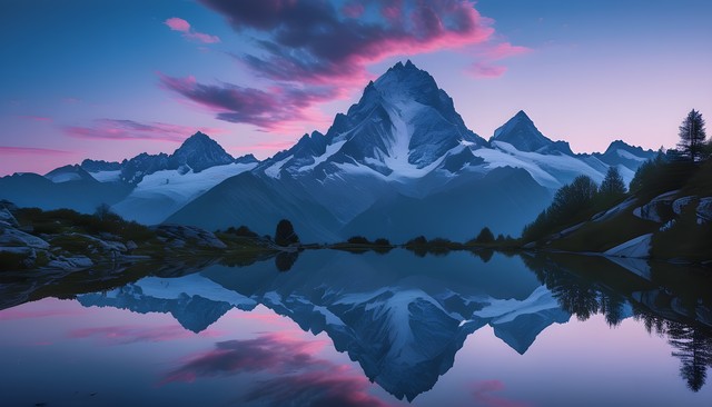 蓝色晨曦下的雪山倒影,宁静的湖面与周围自然景观交相辉映。