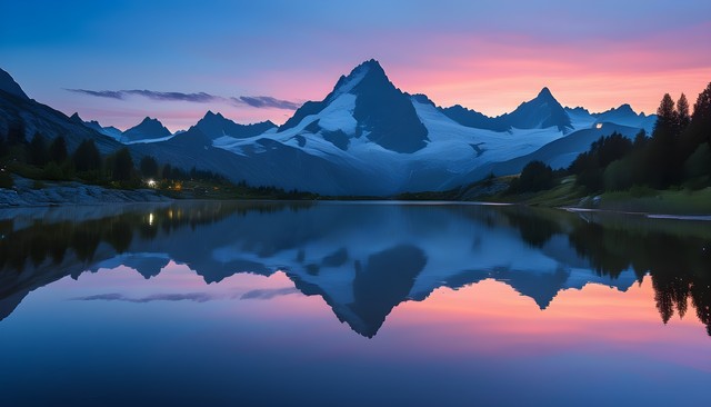 蓝色晨曦下的雪山倒影,宁静的湖面与周围自然景观交相辉映。