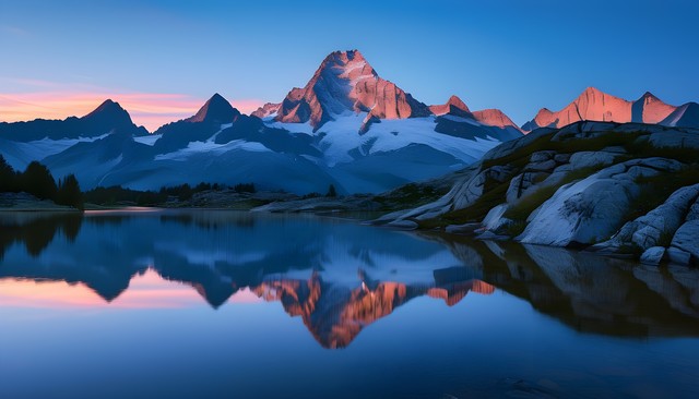 蓝色晨曦下的雪山倒影,宁静的湖面与周围自然景观交相辉映。