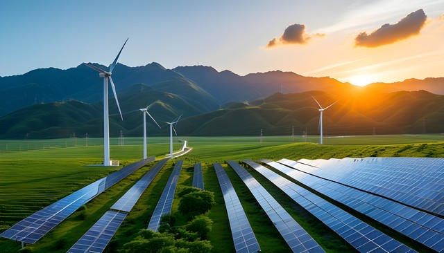 青翠的山丘上,太阳能板和风力发电机并排而立,展现出清洁能源的美丽景象。