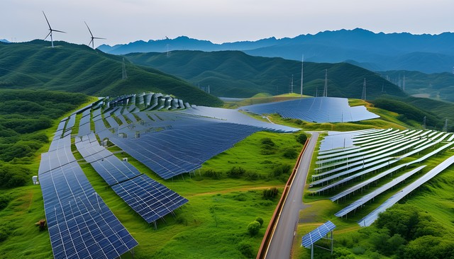 青翠的山丘上,太阳能板和风力发电机并排而立,展现出清洁能源的美丽景象。