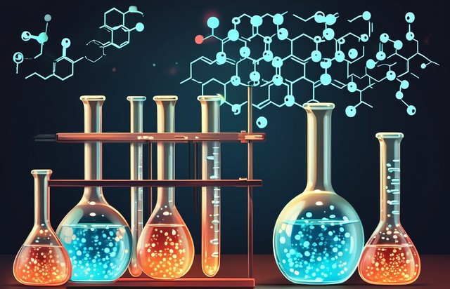 设置线试管和烧瓶化学实验室,脱氧核糖核酸符号,带有想法概念的灯泡和移液管图标。矢量