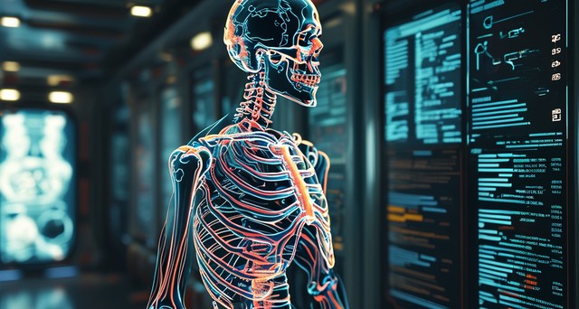 检查代表患者身体、脊柱骨骼的技术数字全息板。概念:未来医学、世界援助和未来。医疗技术概念。