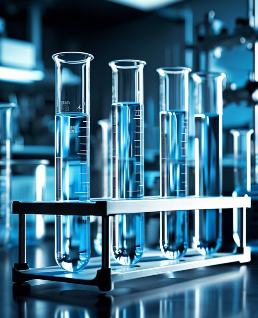 实验室中先进的透明试管和设备,呈现出科技感的蓝色调。