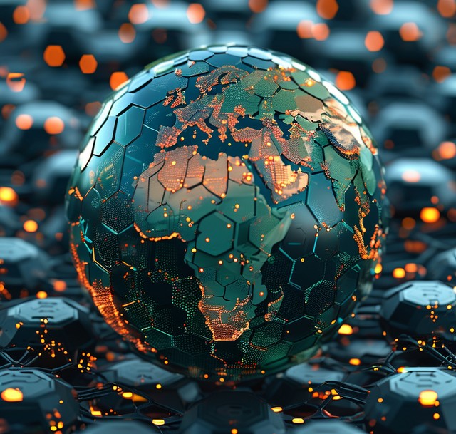 六边形网格组成的未来科技感的地球 代表高科技、大数据和物联网 点阵的球体和六边形网格地球