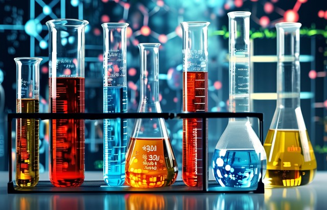实验室中的各类化学试管与烧瓶,展示多种颜色的液体与科技背景。