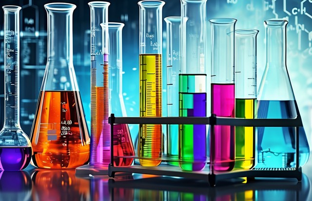 实验室中的各类化学试管与烧瓶,展示多种颜色的液体与科技背景。