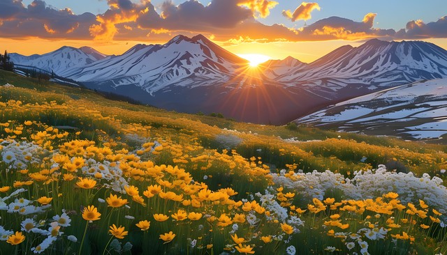 夕阳映衬下的雪山与盛开的黄色野花,构成了美丽的自然风景。