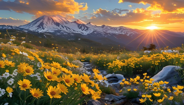 夕阳映衬下的雪山与盛开的黄色野花,构成了美丽的自然风景。
