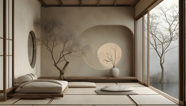 和风雅致的客厅,圆形墙面设计与自然元素融合,营造宁静舒适的氛围。