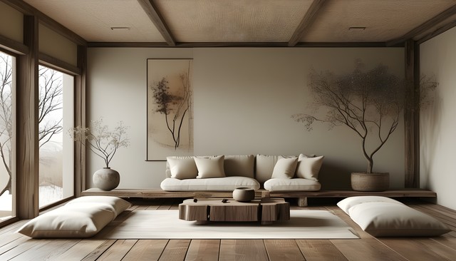 和风雅致的客厅,圆形墙面设计与自然元素融合,营造宁静舒适的氛围。