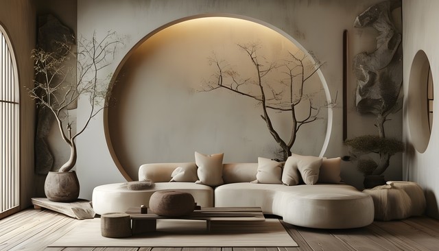 和风雅致的客厅,圆形墙面设计与自然元素融合,营造宁静舒适的氛围。