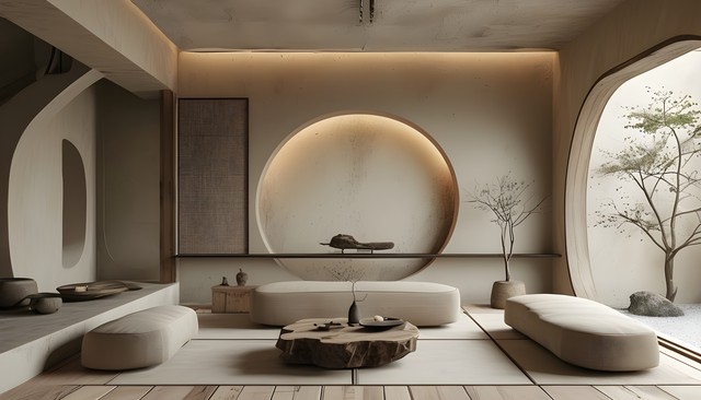 和风雅致的客厅,圆形墙面设计与自然元素融合,营造宁静舒适的氛围。