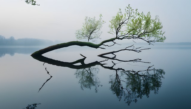 水面上静谧的树枝与其倒影,展现自然的宁静美感。