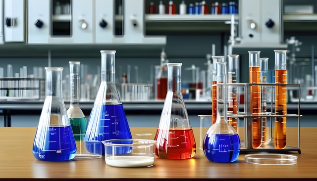 实验室桌面上的各类化学试剂与器具,色彩丰富,彰显科学魅力。