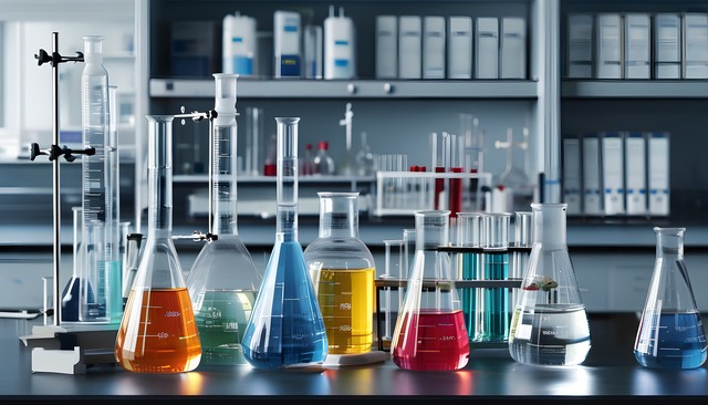 实验室桌面上的各类化学试剂与器具,色彩丰富,彰显科学魅力。
