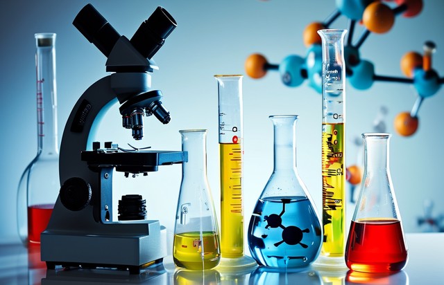 显微镜和装有化学试剂的烧瓶